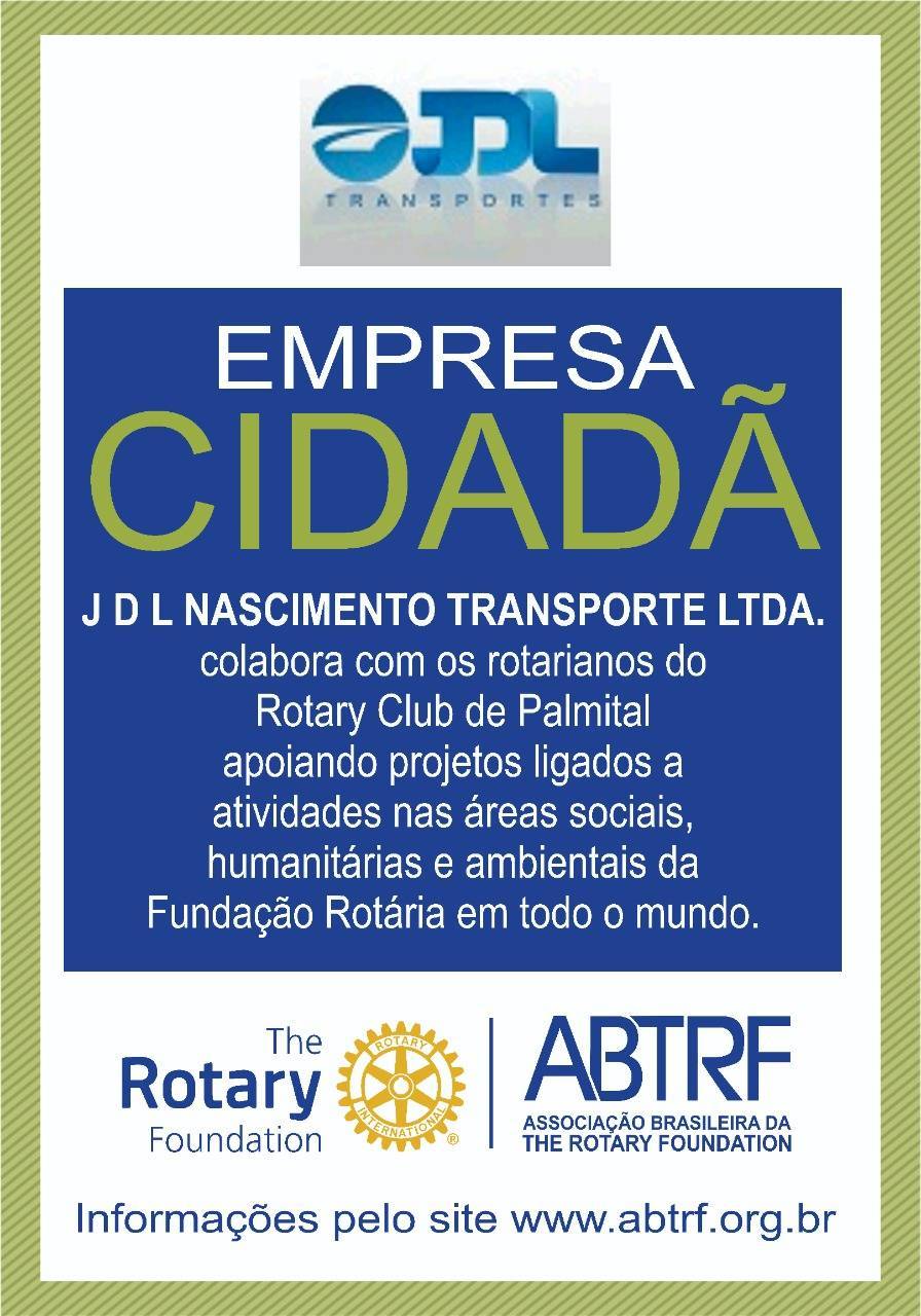 "Estamos felizes em poder conseguir a adesão da nossa 1a. empresa cidadã da ABTRF do Rotary Club de Palmital, a JDL NASCIMENTO TRANSP.LTDA, isto nos motiva e estamos trabalhando para que consigamos a proxima." Expressou o G.A. e Cp. Rodrigo Montoro, associado do Rotary Club de Palmital.